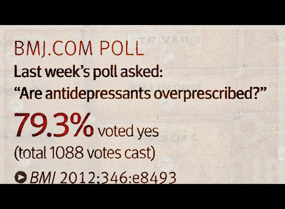 [12] Moore, Michael, Kendrick, Tony et al. Explaining the rise in antidepressant prescribing: a descriptive study using the general practice research database. British Medical Journal. 15 October 2009. 10.1136/bmj.b3999